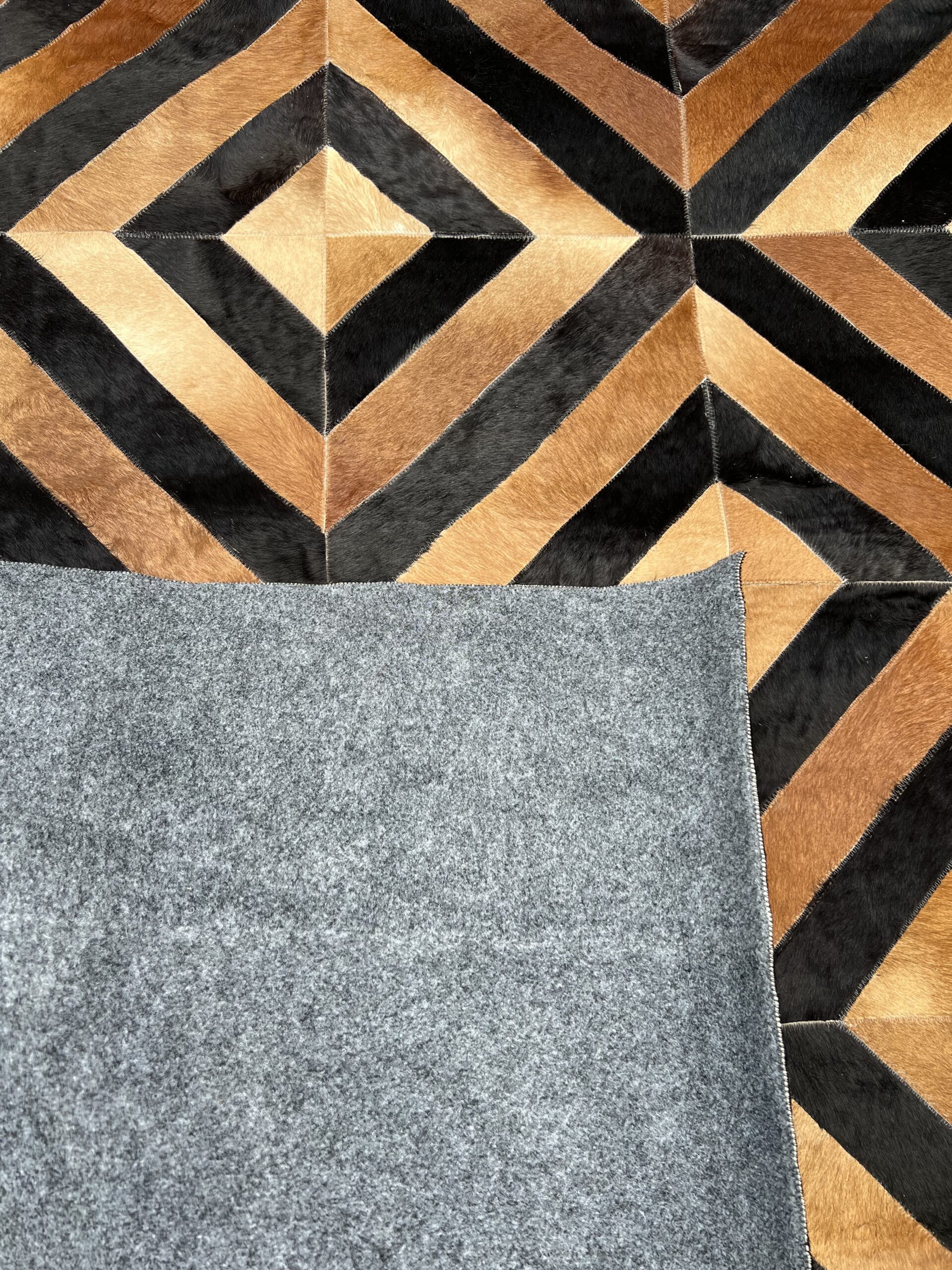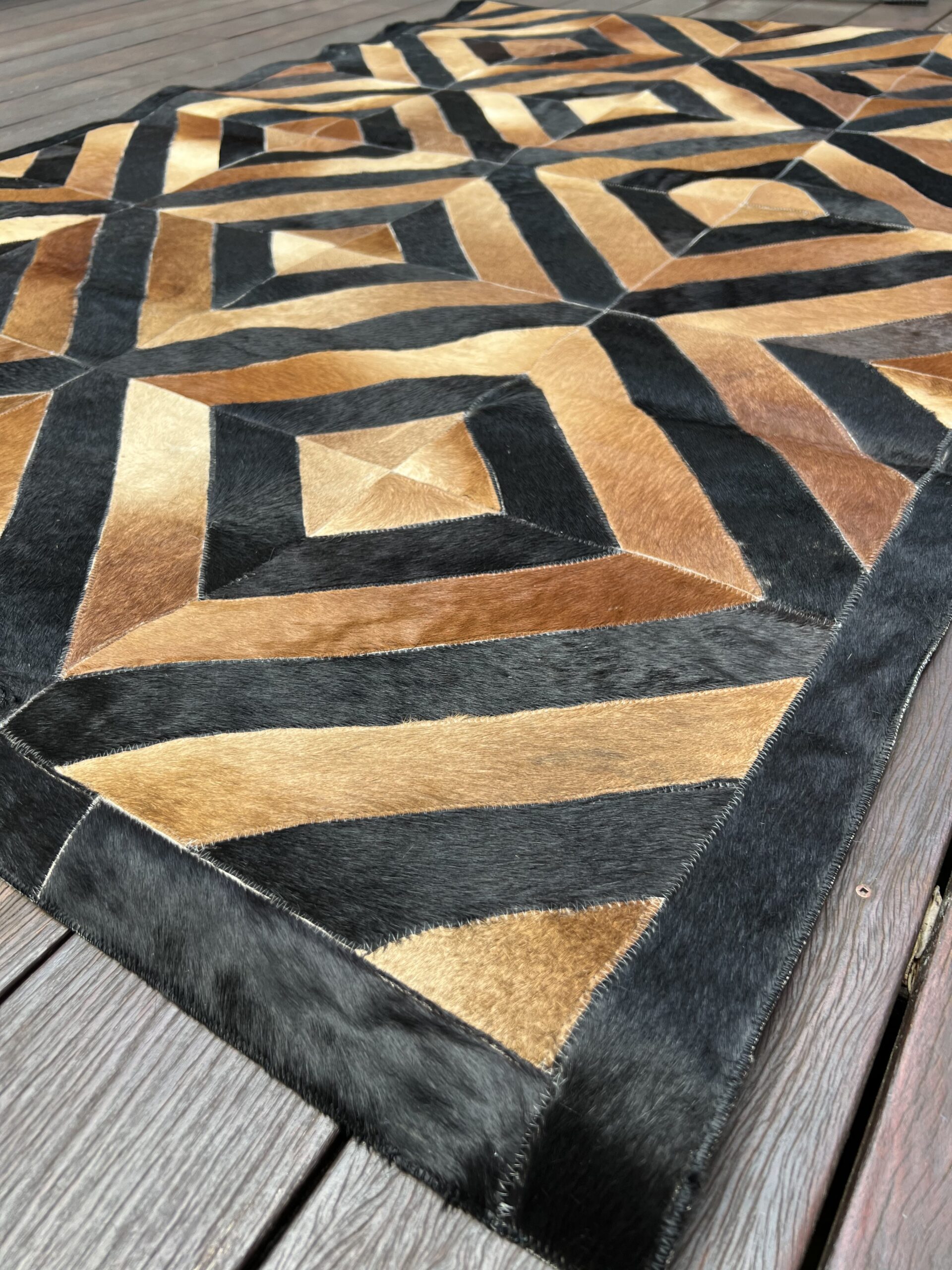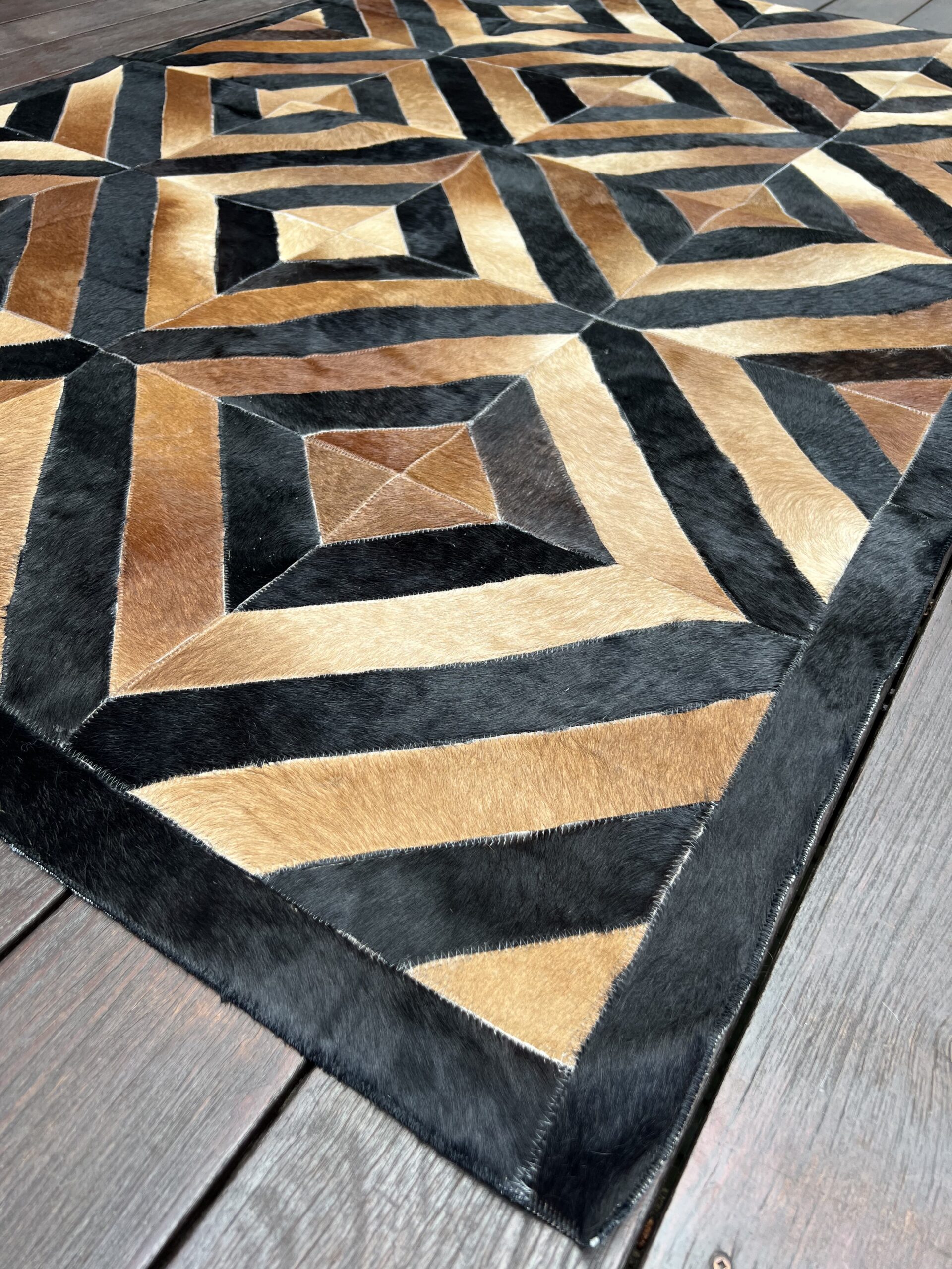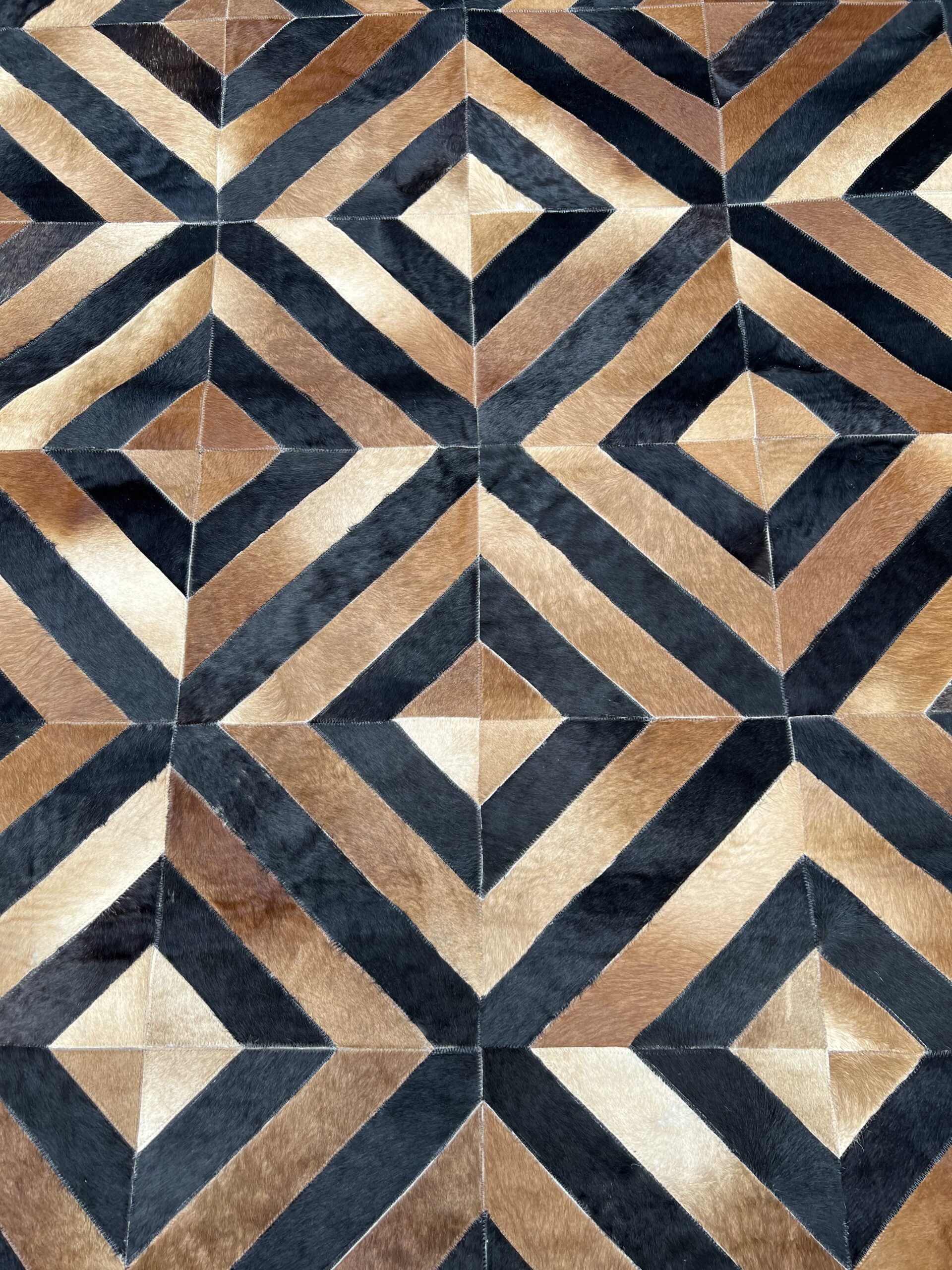 The eye-catching geometric design and the dramatic color combinations of the Handmade Leather Patchwork cowhide rug make it the center piece of any room, perfect for brightening, adding warmth and charm, or just a touch a welcome to your home.